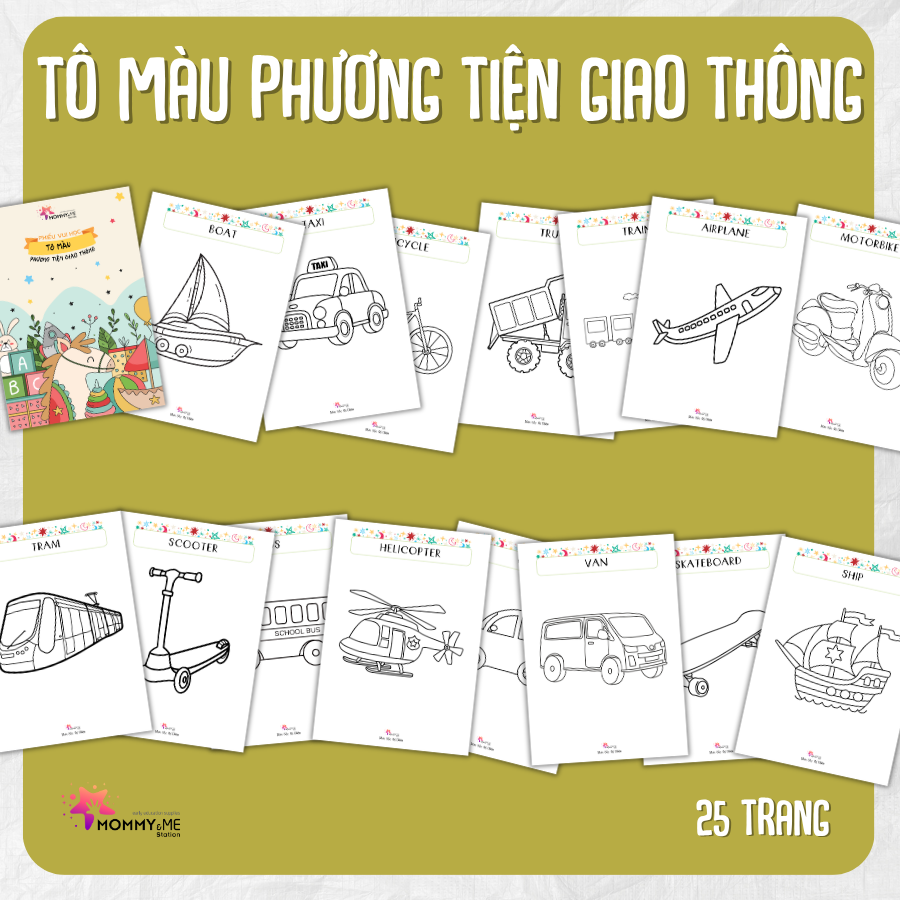Chúng tôi giới thiệu đến bạn bộ PDF 25 trang A4 tô màu Phương Tiện Giao Thông, đặc biệt dành cho trẻ từ 2-6 tuổi. Bộ sản phẩm này không chỉ giúp trẻ làm quen với các phương tiện giao thông quen thuộc như ô tô (CAR), xe buýt (BUS), xe đạp (BICYCLE), máy bay (AIRPLANE), tàu hỏa (TRAIN), xe cứu thương (AMBULANCE), tàu ngầm (SUBMARINE)… mà còn giúp trẻ học tiếng Anh một cách dễ dàng và thú vị.