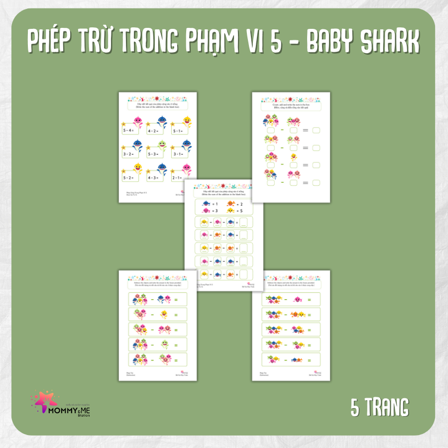 **Bộ 5 Trang Phép Trừ Trong Phạm Vi 5 – Baby Shark** là sản phẩm hoàn hảo dành cho các bé từ 4 đến 7 tuổi. Với các hoạt cảnh sinh động và nhân vật dễ thương từ thế giới Baby Shark, bộ tài liệu này giúp trẻ dễ dàng hiểu và thực hành phép trừ. Các bài tập được thiết kế thông minh, không chỉ rèn luyện khả năng toán học mà còn phát triển tư duy số lượng của trẻ.