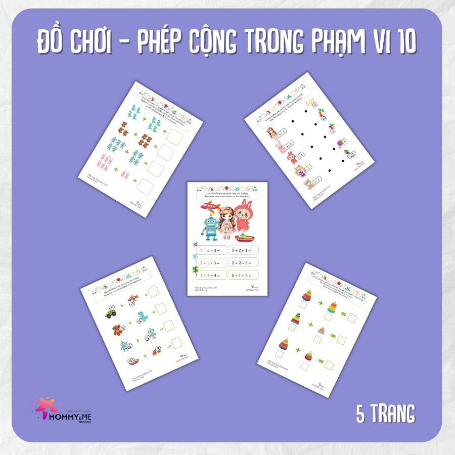 Khám phá bộ tài liệu “Phép cộng trong phạm vi 10 – Đồ Chơi” gồm 5 trang bài tập hấp dẫn, giúp trẻ em phát triển kỹ năng cộng toán học một cách hiệu quả và thú vị. Với hình ảnh đồ chơi sinh động, bộ tài liệu này không chỉ giúp trẻ em thực hành phép cộng mà còn rèn luyện khả năng nhẩm và hiểu biết về mối liên hệ giữa hình và số. Thiết kế tươi sáng, bắt mắt sẽ thu hút sự chú ý của các bé, khiến việc học trở nên thú vị hơn bao giờ hết.