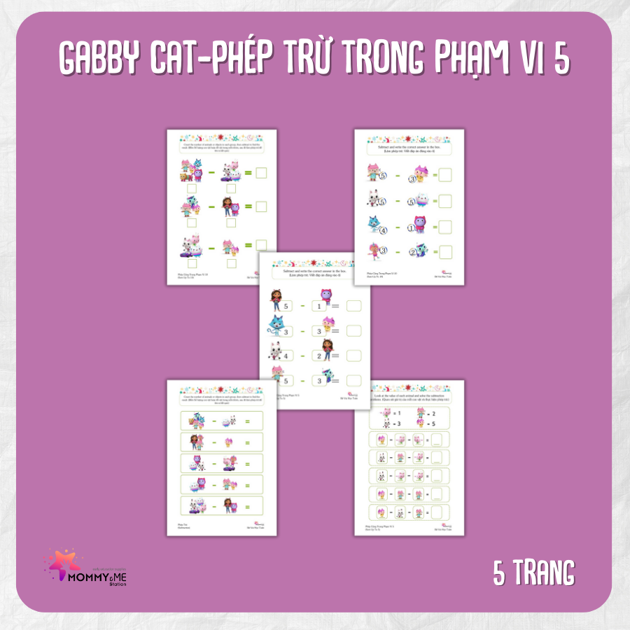 **Bộ 5 Trang “Phép Trừ Trong Phạm Vi 5 – Gabby Cat”**