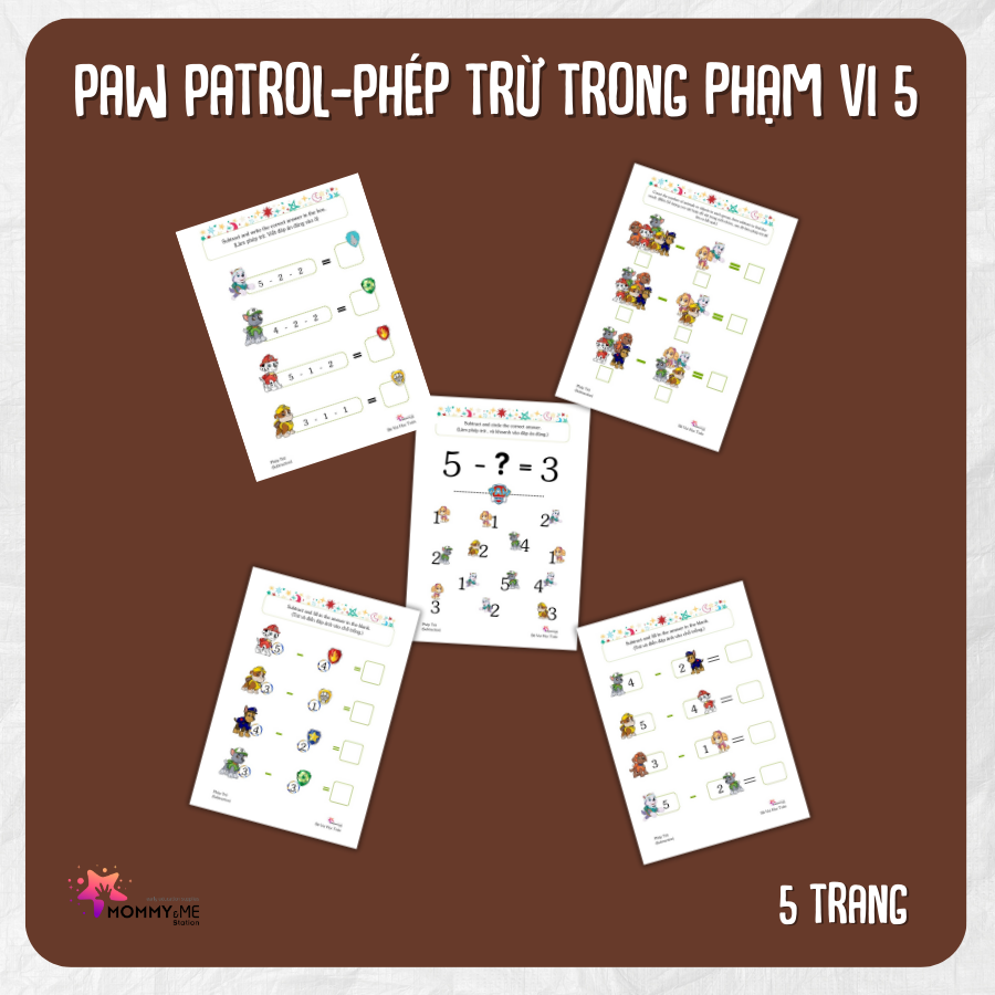 Khám phá bộ tài liệu “Phép trừ trong phạm vi 5 – Paw Patrol” dành riêng cho các bé yêu thích nhân vật Paw Patrol! Bộ 5 trang file mềm này không chỉ giúp trẻ em làm quen với khái niệm “bớt đi” một cách thú vị, mà còn rèn luyện tư duy logic toán học hiệu quả. Với những hình ảnh minh họa ngộ nghĩnh và sinh động từ các nhân vật quen thuộc, bé sẽ học tập một cách tự nhiên và hào hứng hơn.